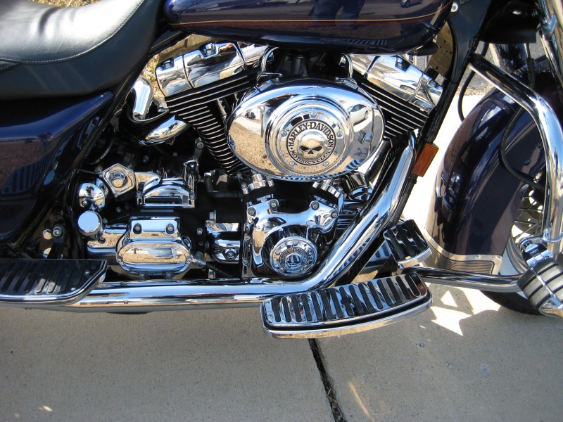 The bike comes with Stage 1 intake and Rinehart exhaust that sounds great. Not crazy loud unless you're riding behind it at freeway speeds, then it can get a little noisy (or so I'm told). It has the white wall tires on it which are still in pretty good shape, and has a few Willie G logos put on at the dealership. The engine has all sorts of Harley chrome parts on it and everything was installed at the dealership. I have all records of purchased parts and installation dates. I does come with passenger backrest/ luggage rack and I've installed the lever adjustable backrest for the driver. All the floorboards have been upgraded, as well as the mirrors with the LED mirrors. All controls are chromed including buttons, and the entire front end forks are chromed. All lights have the chrome eyelids and since the pictures were taken, I've replaced the orange turn signal lenses with clear lenses and orange bulbs. The tops of the bags show a little wear, but I think they could be cleaned up with a good leather cleaner/conditioner.