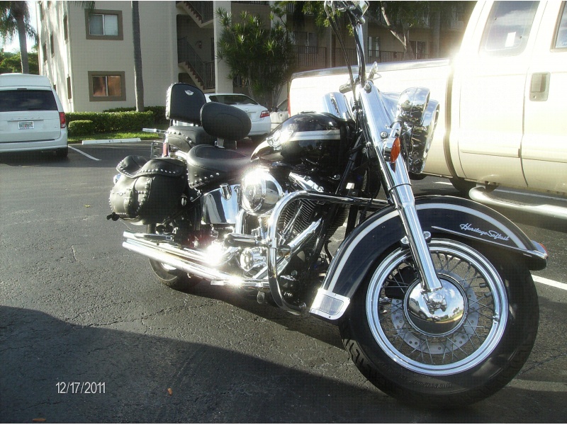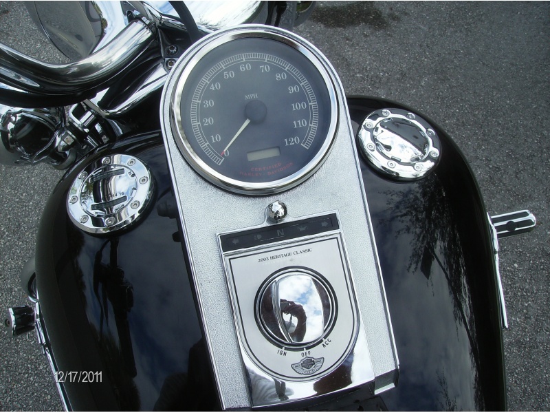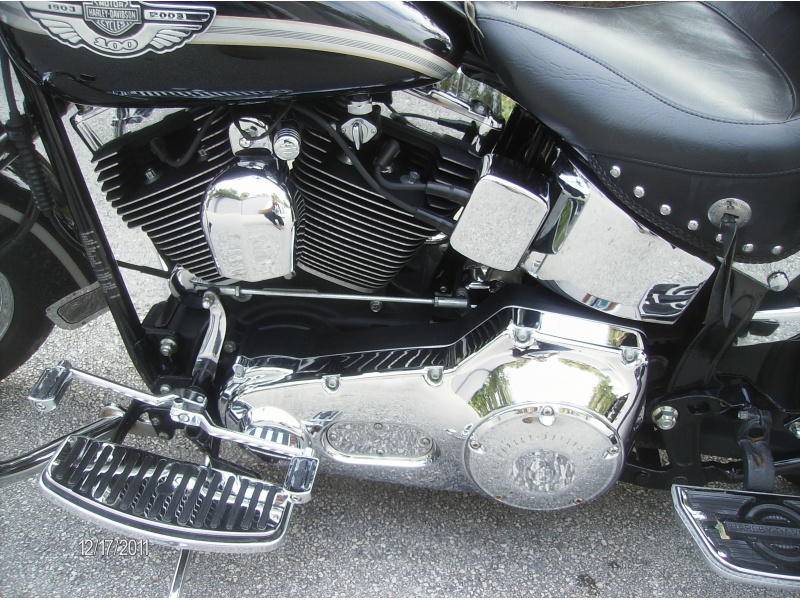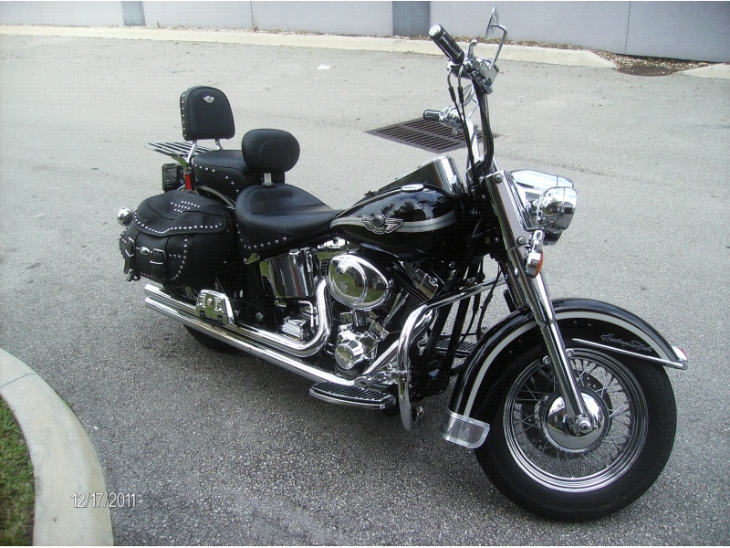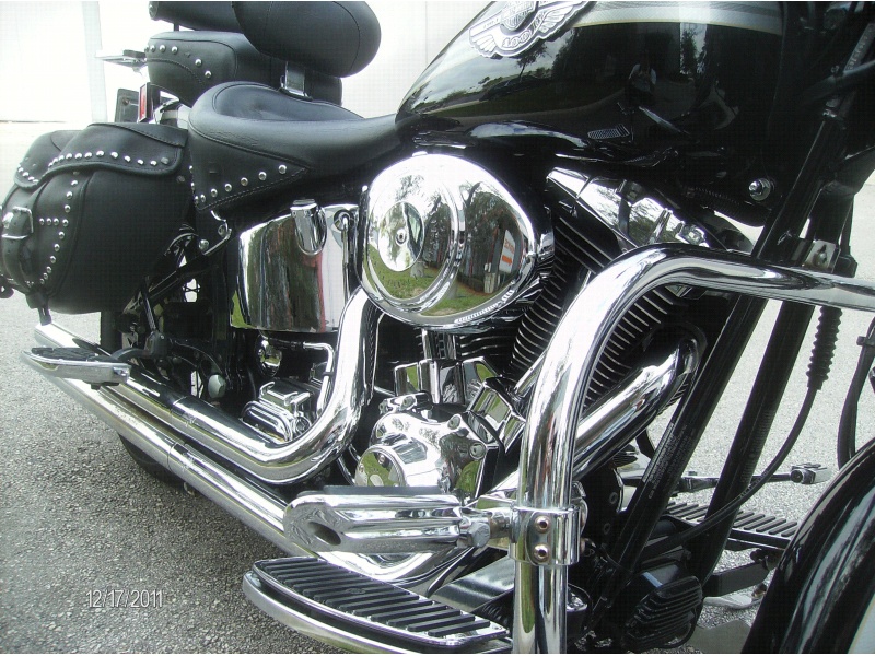 Engine Trim Powdercoated black w/ chrome covers, Exhaust System Chrome staggered shorty duals, Oil Tank Chrome "Horseshoe" w/ chrome external oil lines, Ignition Barrel key, tank console-mounted, Windshield Detachable king-size Lexan, Passenger Backrest Standard, Saddlebags Nostalgic studded leather, Foot Supports Full-length operator floorboards w/ heel-toe shifter lever, Rear Fender Full coverage, Rear Fender Supports Chrome, Fork Lock Barrel key, common w/ ignition, Instruments Electronic speedometer w/ odometer and resettable tripmeter w/ diagnostic readout capabilities, Flasher Hazard warning integrated into turn signal controls