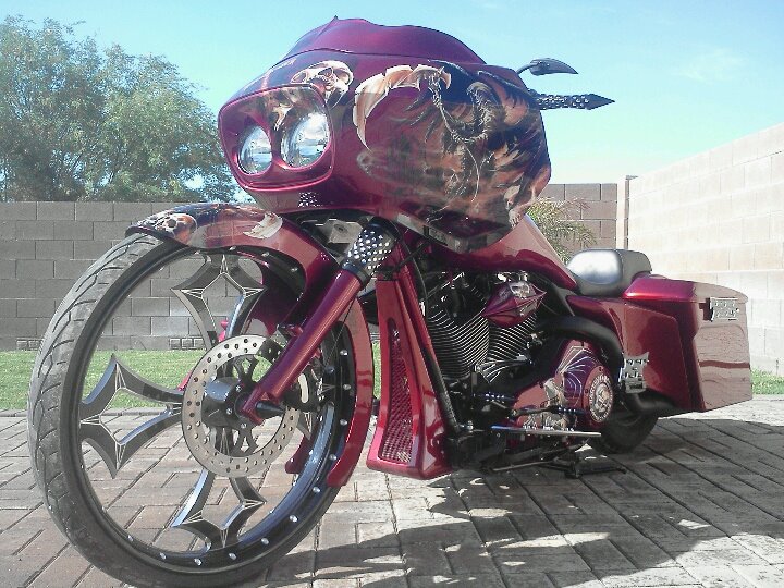 Road Glide All new Custom Paint ,Wheel 26"New 4" Stretched Saddle Bags,Hot Rod Saddle Bag Lids, Liners for Saddle Bags, Side Filler Panels, Rear Fender,Curved LED License Plate Frame, stretched tank, Wicked Road Glide Windshield,Gauge Housing, Pissed off Headlight Bezel, Horn Cover,Accent Glove Box Doors, Hot Rod Bars,Axle Caps,Assassin Grips,Black Cut Floorboards,Black Bag Latches the lest go's on.