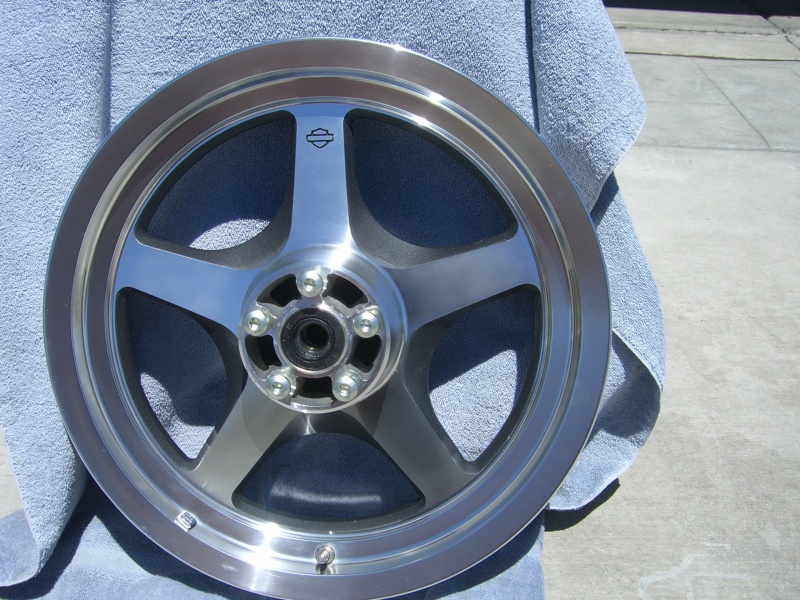 H-D Lightning Star front and rear wheels used for 3 months. Part # front wheel 43733-19 fits 84-96 XL, FXR and 91 and later FXD models. Part # rear wheel 43785-99 fits 86-99 XL, FXR, Softail and 91-99 Dyna models.