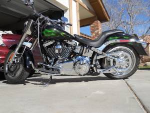 2007 Custom Harley Davidson Fatboy - $14K OBO. It's an FLSTF with 11K miles, has a lot of after-market chrome including nuts, bolts, screws and the swing arms. It has LED lights in swing arms, a custom made seat, a new 220 rear tire, a custom paint job with the seam removed from the tank, braided lines, a screaming eagle race kit and stage 2 kit race tuner. I have the original seat, wind shield and saddle bags that go with it. It's been lowered, has Vance and Hines exhaust, and other accessories.
