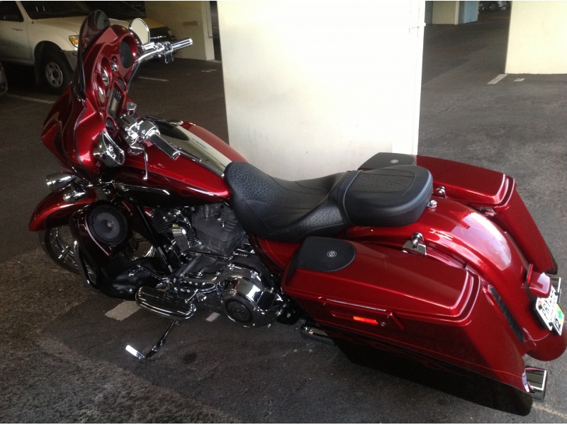 Typhoon red custom paint with ghost flames, CD player , cruise control, am/fm radio , iPod hook up, custom front driving lights added , red led lights in the engine comp, 8 speakers , speakers on the hard bags, 6 years left on the extended warranty, plus more only has under 3500 miles, bike is in mint condition