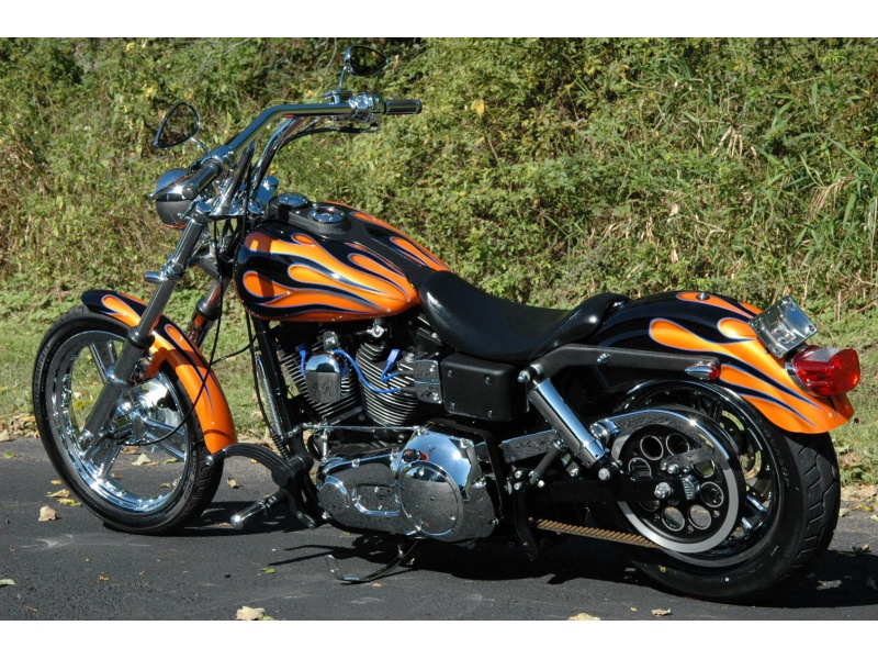 Orange 2000 Harley-Davidson Dyna Wide Glide Chopper 7200 miles, 1550cc, Custom flamed paint. Professionally raked neck w/ 4" over chrome wide glide front end with chrome lower legs/sliders. Trails great! Harley chrome Detonator Three-Spoke Custom Wheels,