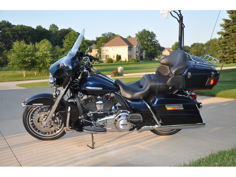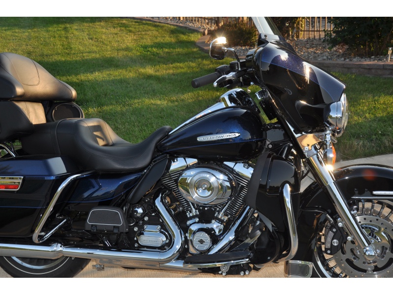 New 2013 Harley Davidson Electra Glide Ultra Limited Edition. Two tone Big Blue and Black. Fully loaded all stock items. Includes one integrated helmet with intercom system for both riders. Extra chrome added to front end including tubes, calipers and wheels. Added features include heated hand grips, cruise control, CB, intercom system plus much more.