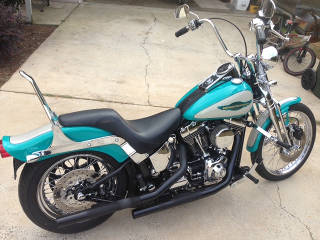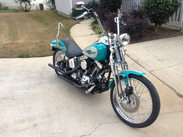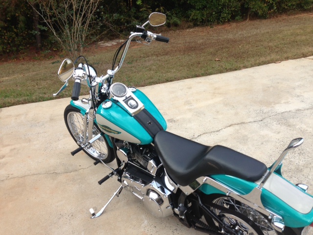 Bike is absolutley spotless, always garage kept never been in the rain! Vance and hines pipes,arlen ness lowering kit,arlen ness big sucker air intake,chrome sissy bar,chrome luggage rack,chrome 12 inch apes with 4 inch risers,chrome highway pegs,harley swingarm bag,21 inch front rim with twisted spokes,16 rear with twisted spokes,brand new tires,new battery,custom harley teal/cream paint. I have the original owners manual and service manual. Your chance to own a custom springer that like brand new. Only reason for selling is to get a bigger bike. Any questions text or call 478-808-0277 Thanks!!