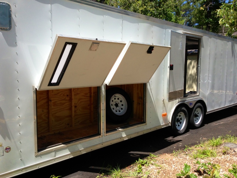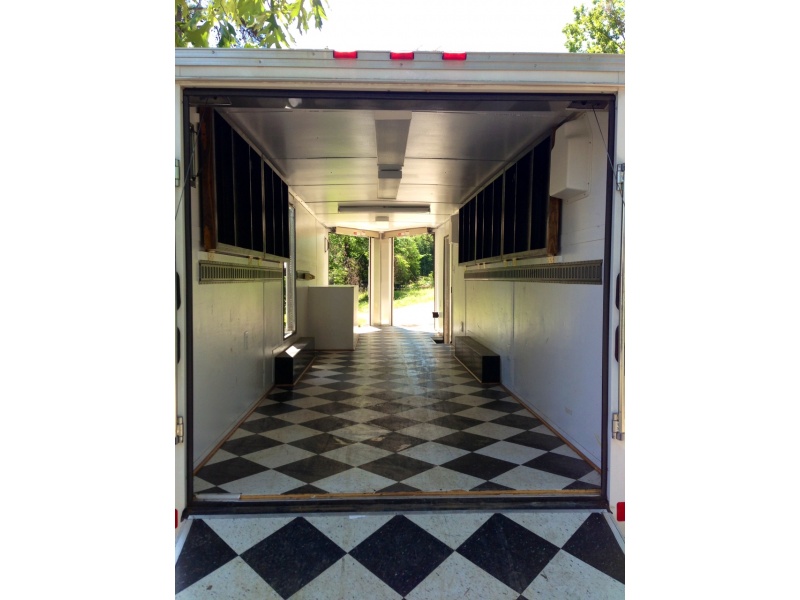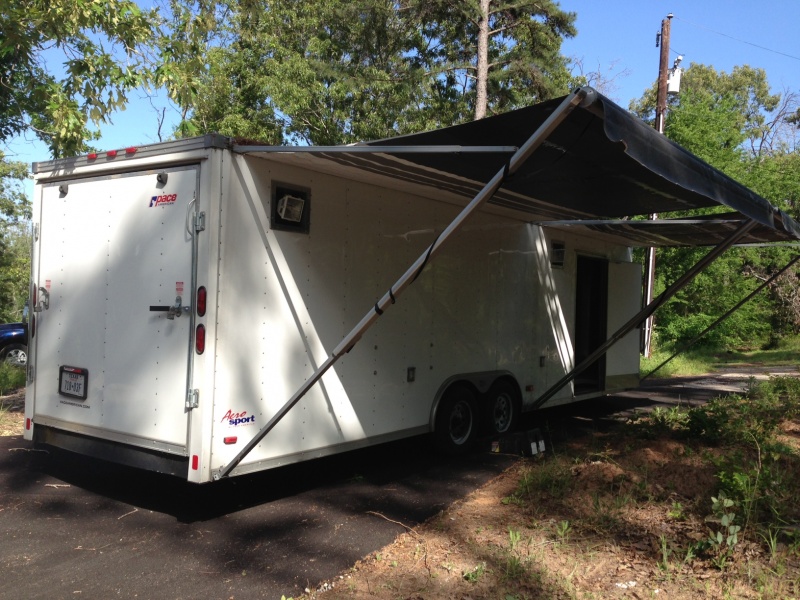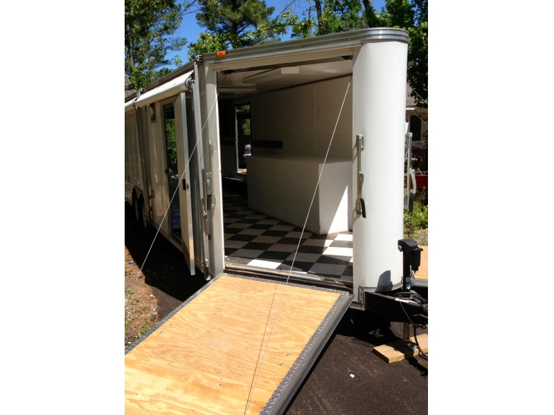2010 Pace American 30ft V-nose enclosed. Bumper pull. Nice pull-out awnings. Rear ramp, front ramps, side door, overaxle door. Side boxes. Generator area. Electric Jack. Spare wheel and tire. Clip-on stainless work table. 110V lights. Halogen exterior lights. Flip down worktables. Tile floor.