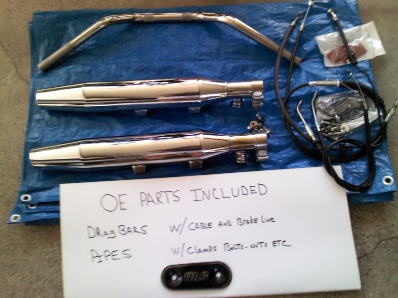 Chiseled HD handle bars, Sport HD windshield, HD passenger pinion with adjustable passenger pegs, HD short sissy bar with cushion, Engine guard with pegs, Vance Hines slip on exhaust (loud)Chromed air breather cover, and OE handle bar,s exhaust, cables brake lines, and hardware. Garage Kept.