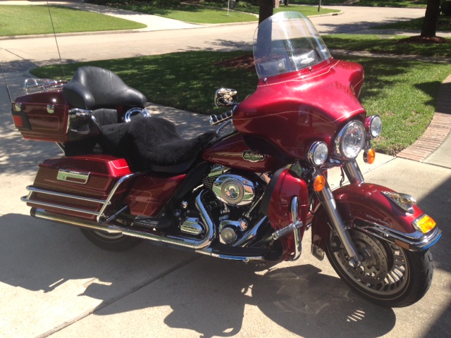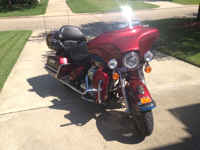 2009 Harley Davidson Ultra Classic Electra Glide (FLHTCU) in excellent condition with double set of gold LED accent lights. This bike comes with a 4-stroke, 1584cc, OHV, V-twin engine. Fuel injection makes for effortless cold starts and smooth power delivery. Harley has additional Screaming Eagle fender mount with gold eyes. Deep Sunglo red with chrome accents, low mileage, and garage kept. Only selling due to medical condition which is halting riding career.