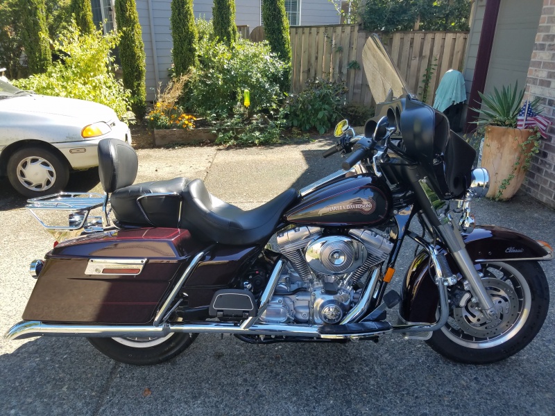 2005 FLHTI with 16,084 easy miles. Has new Deka battery. Stage I Screamin' Eagle kit. "Classic" or FLHTCI two-tone Black Cherry Pearl and Black Pearl bodywork with red pinstripes. Detachable "easy-dock" passenger backrest and luggage rack. Miscellaneous chrome add-ons and engine-turned inserts, highway pegs and Locomotion clock. Unique features of this model are the Batwing fairing with integrated instrumentation, silver powder-coated Twin Can 88 engine, nylon alloy lockable saddlebags, comfort stitched touring saddle, triple disc brakes, air adjustable rear suspension, electrical power outlet and cigarette lighter.