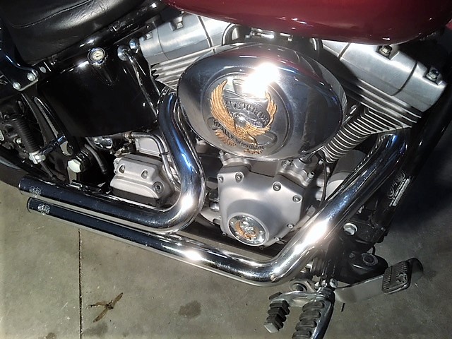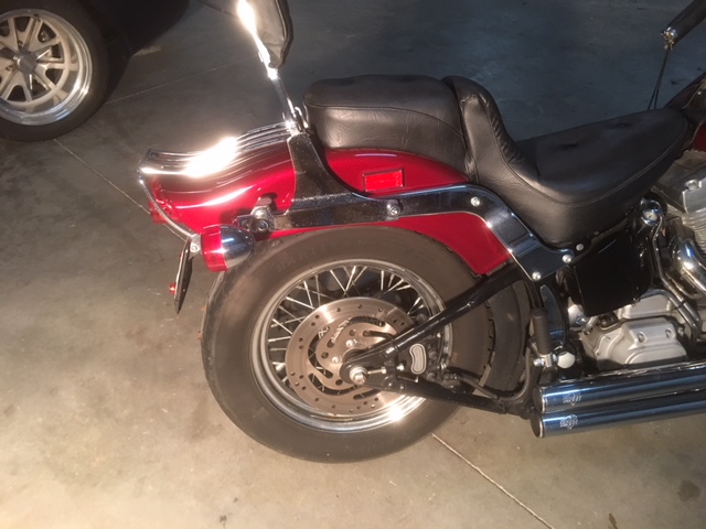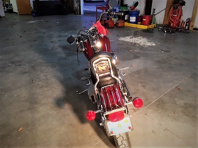 Mustang wide Regal Duke seat, 42mm Mikuni carb, V&H Short Shot pipes (no baffle), luggage rack, quick detach passenger backrest(sissy bar) , quick detach windshield, rear suspension lowering kit, tank pouch, tail light kit installed (blinkers are now red and work in conjunction with the brakes and lights, lots of Live to Ride/Ride to Live emblems, Chrome disc brake lock,