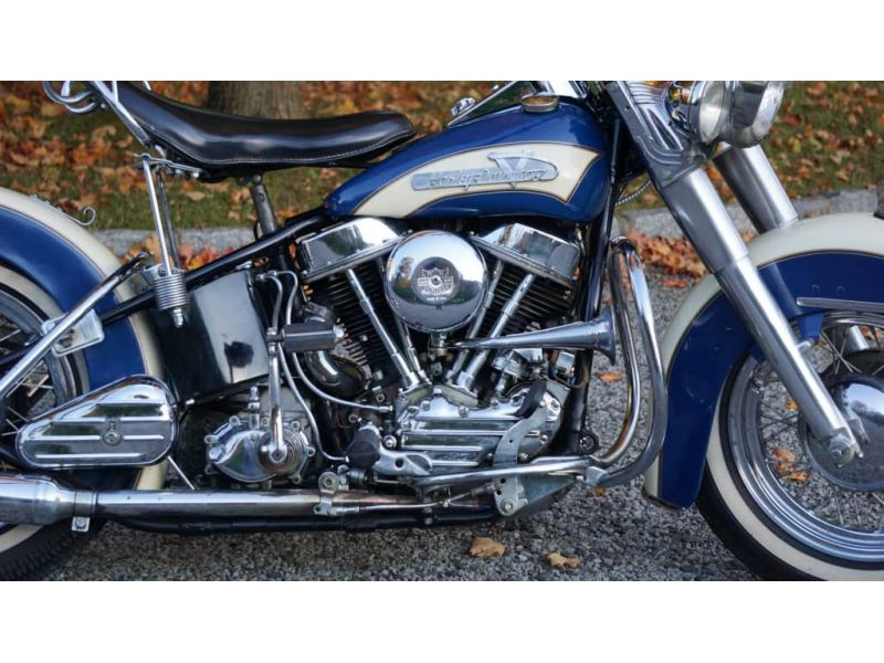 The bike is powered by a 74ci Panhead V-twin paired with a hand-shifted four-speed transmission and is finished in blue and cream. Features include a sprung solo saddle, a Hydra Glide fork, 16? wire-spoke wheels, engine and rear guards, valanced fenders, rubber-lined footboards, a dual chrome exhaust system, and both rear and side stands. The 74ci Panhead V-twin features a Linkert carburetor, a two-into-two exhaust system with dual chrome mufflers, and a kickstarter. The engine features a dry-sump oiling system and a distributor-type ignition system. Service in preparation for the sale is said to have included draining the fuel system, changing the oil, and replacing the spark plugs, fuel lines, air filter, and ignition points.