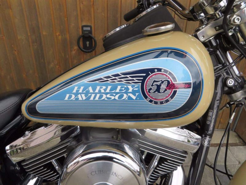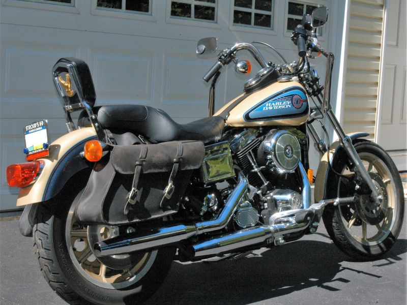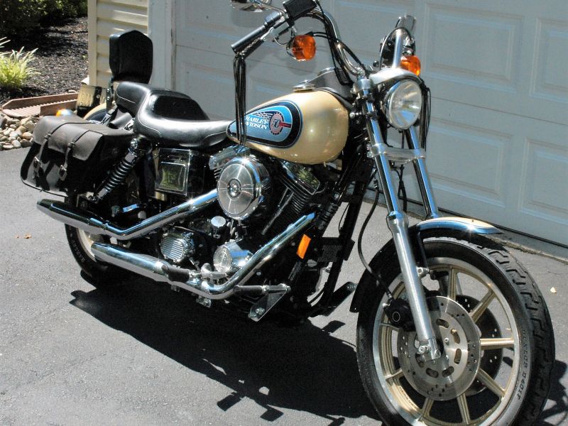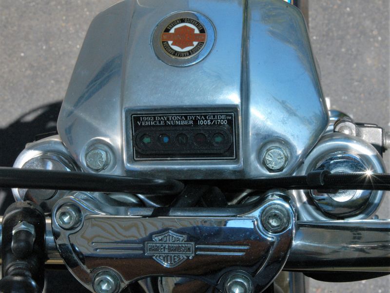 Limited edition 1992 Daytona Dyna-Glide (FXDB, the 50th Anniversary edition for Daytona), number 1005 of only 1700 ever produced, all factory parts, only 9700 miles, pristine condition, with leather Harley saddlebags. The '92 engine model is the 1337 cc (81.5 cubic inches) four stroke 45 deg. V-twin, 2 valves per cylinder, with a 38mm Keihin carburetor. Bike is in Southeastern PA.