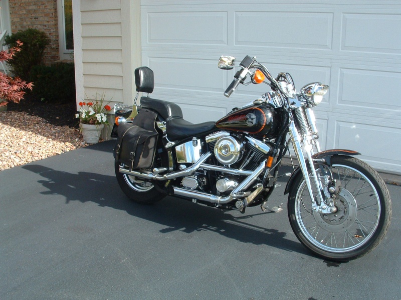 1993 Springer Softail with Mikuni HSR42 carb, high flow air filter and slash cut performance exhaust pipes, adds about 13 hp, comes with 2 seats (1) fatboy style seat and (1) std. softail, lots of chrome includes saddle bags, leather dash panel, bolt on isolation footpegs, sissy bar and luggage rack.